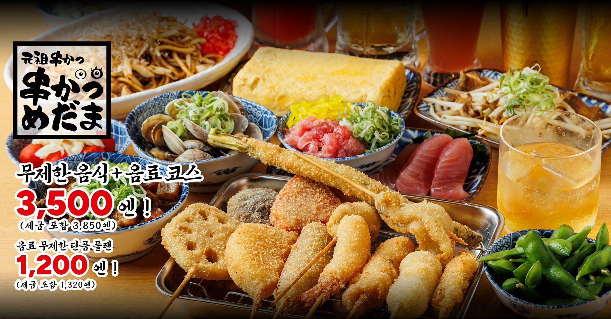 쿠시카츠는 물론, 명물 요리까지 포함된 전 100품 「음식+음료 무제한 코스」가 쿠폰 이용 시 4,500엔(세금 포함 4,950엔) → 3,500엔(세금 포함 3,850엔)!