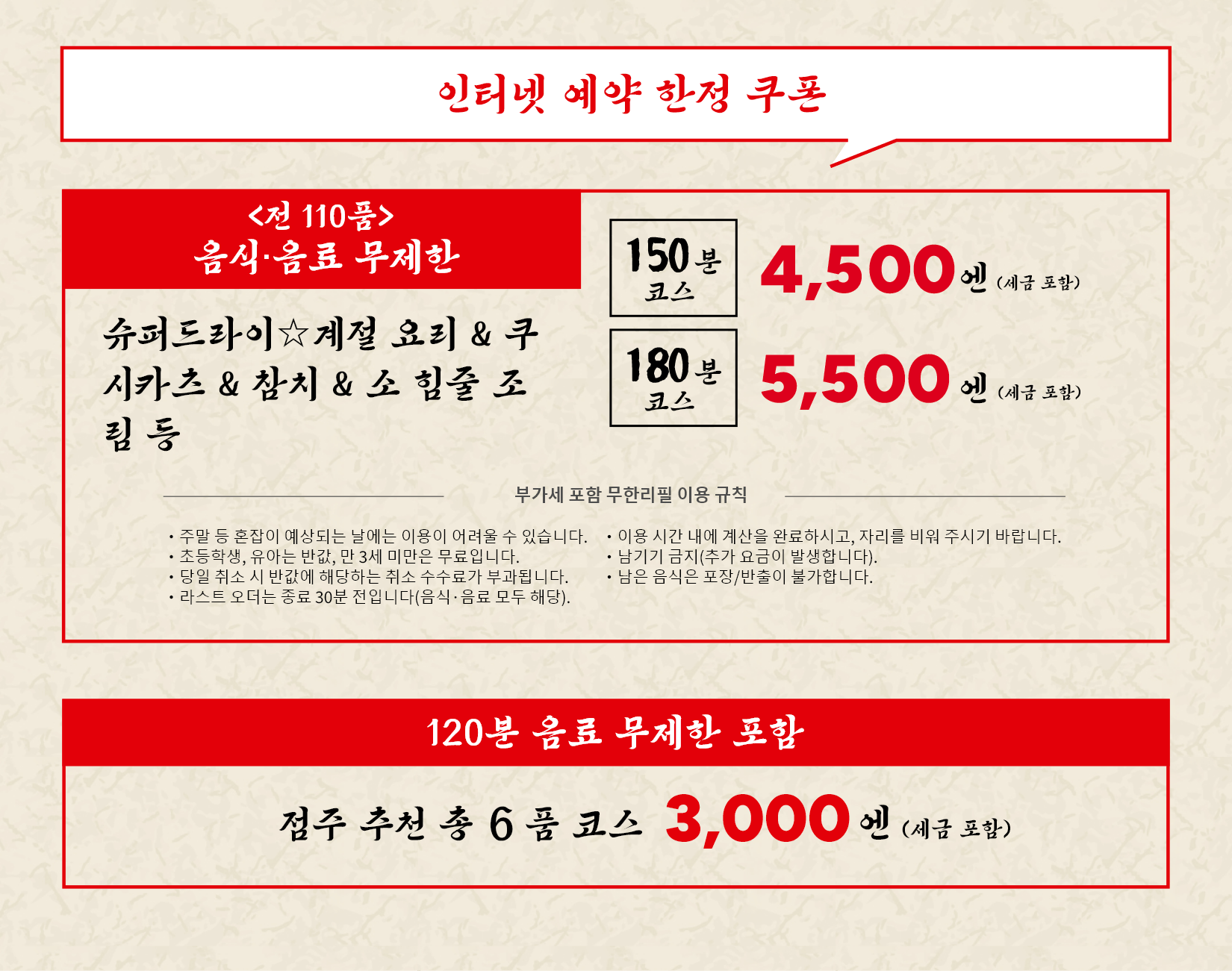 아사히 슈퍼드라이 290엔(세금 포함 319엔), 단품 음료 무제한 1,200엔(세금 포함 1,320엔), 그리고 음식+음료 무제한 코스는 단 3,273엔(세금 포함 3,600엔)!