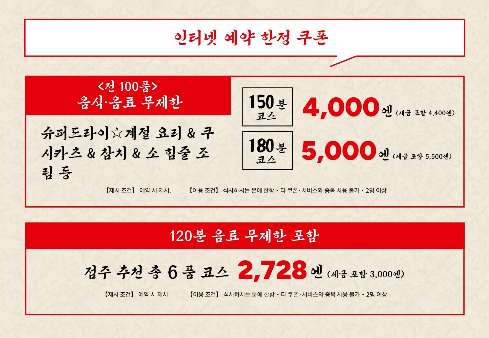 전 100종 음식+음료 무제한 코스